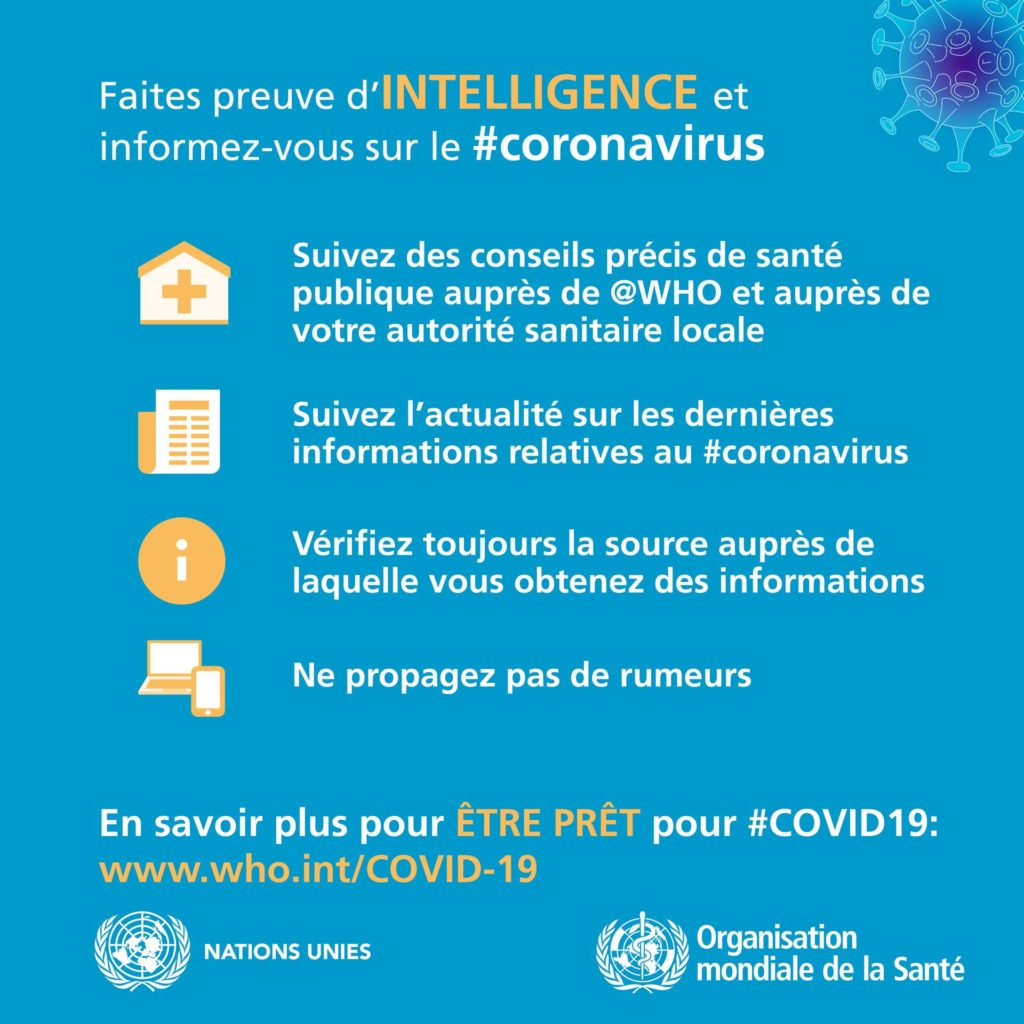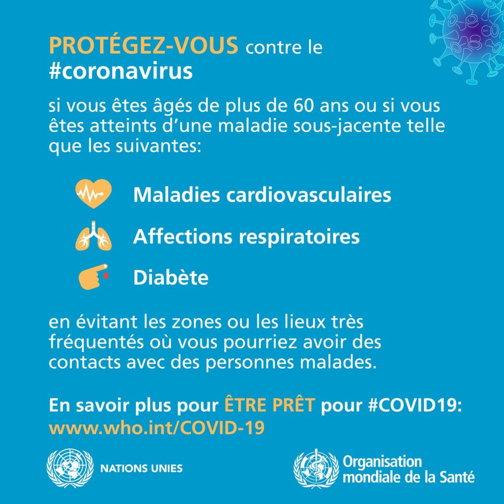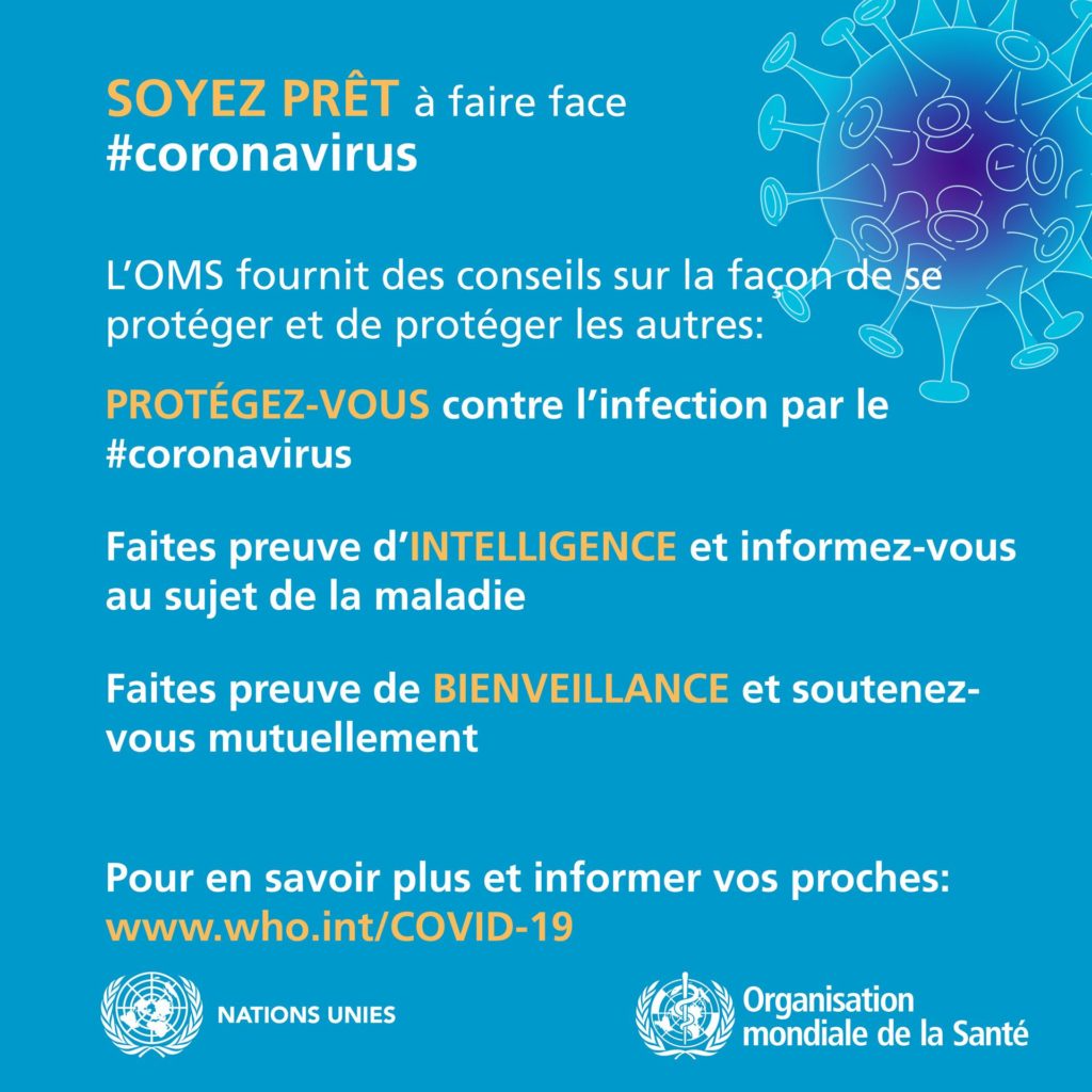 Tenez-vous au courant des dernières informations sur la flambée de COVID-19, disponibles sur le site Web de l’OMS et auprès des autorités de santé publique nationales et locales. La COVID-19 continue de toucher surtout la population de la Chine, même si des flambées sévissent dans d’autres pays. La plupart des personnes infectées présentent des symptômes bénins et guérissent, mais d’autres peuvent avoir une forme plus grave. Prenez soin de votre santé et protégez les autres en suivant les conseils ci-après :