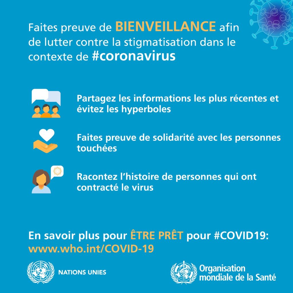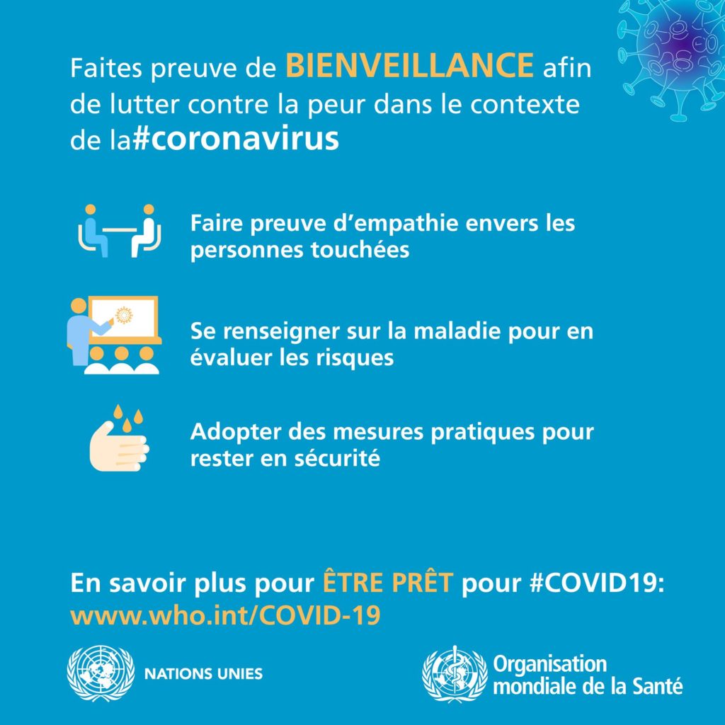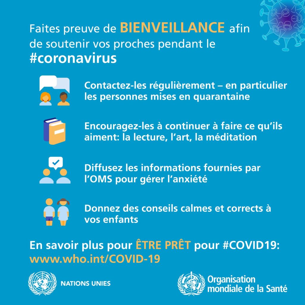 Tenez-vous au courant des dernières informations sur la flambée de COVID-19, disponibles sur le site Web de l’OMS et auprès des autorités de santé publique nationales et locales. La COVID-19 continue de toucher surtout la population de la Chine, même si des flambées sévissent dans d’autres pays. La plupart des personnes infectées présentent des symptômes bénins et guérissent, mais d’autres peuvent avoir une forme plus grave. Prenez soin de votre santé et protégez les autres en suivant les conseils ci-après :