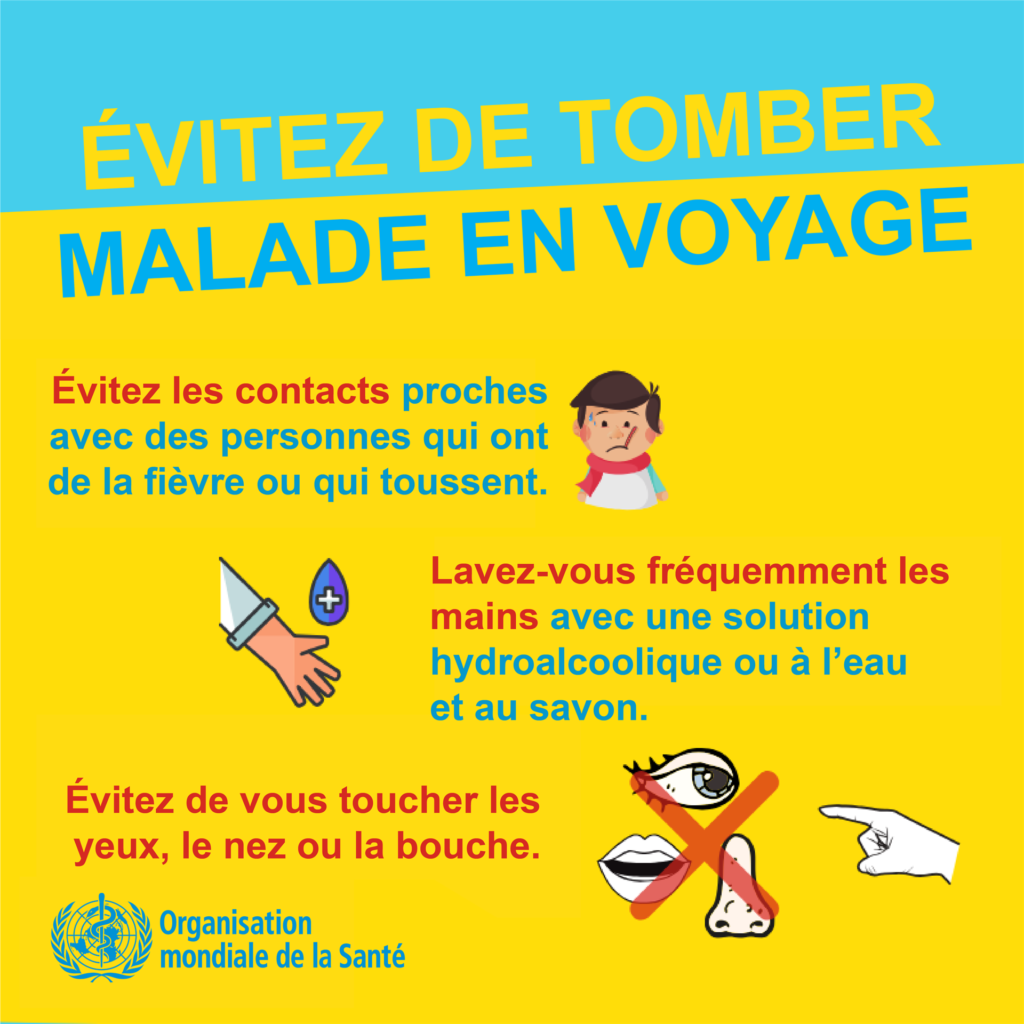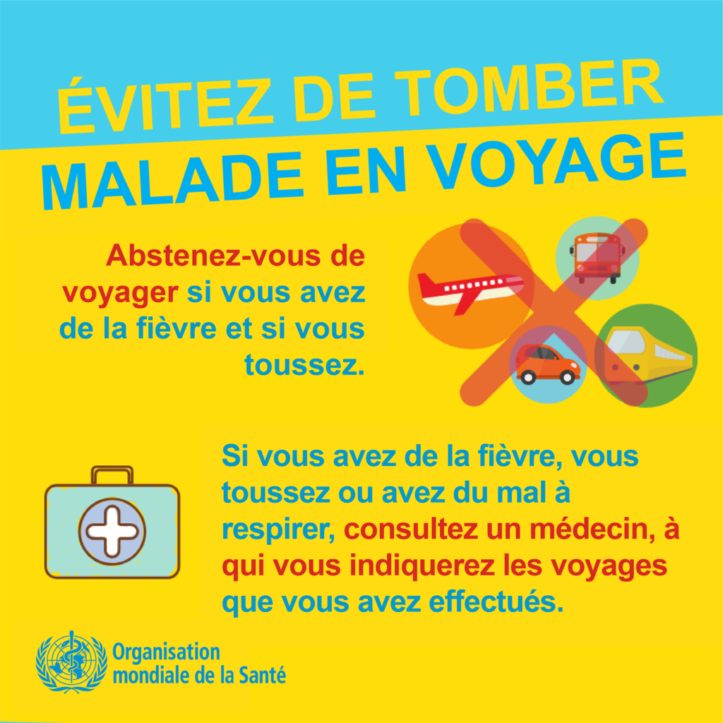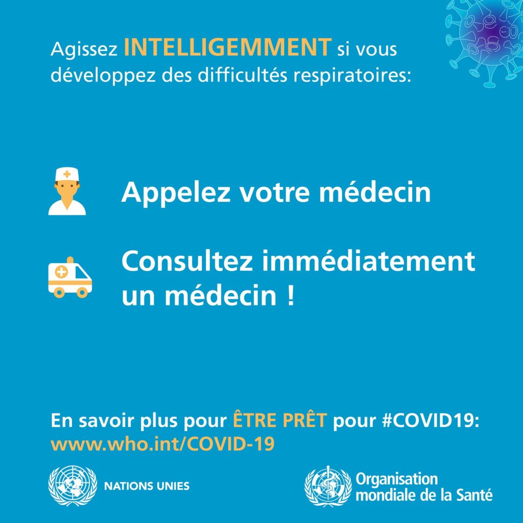 • En cas de fièvre, de toux et de difficultés respiratoires, consultez un médecin sans tarder, car il peut s’agir d’une infection respiratoire ou d’une autre affection grave. Appelez votre médecin et indiquez-lui si vous avez récemment voyagé ou été en contact avec des voyageurs. Pourquoi ? Si vous l’appelez, votre médecin pourra vous orienter rapidement vers l’établissement de santé le plus adapté. En outre, cela vous protègera et évitera la propagation de la COVID-19 et d’autres maladies virales.