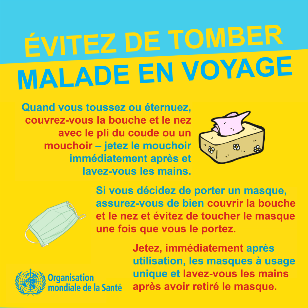 Se couvrir la bouche et le nez avec le pli du coude ou avec un mouchoir en cas de toux ou d’éternuement – jeter le mouchoir immédiatement après dans une poubelle fermée et se laver les mains avec une solution hydroalcoolique ou à l’eau et au savon.