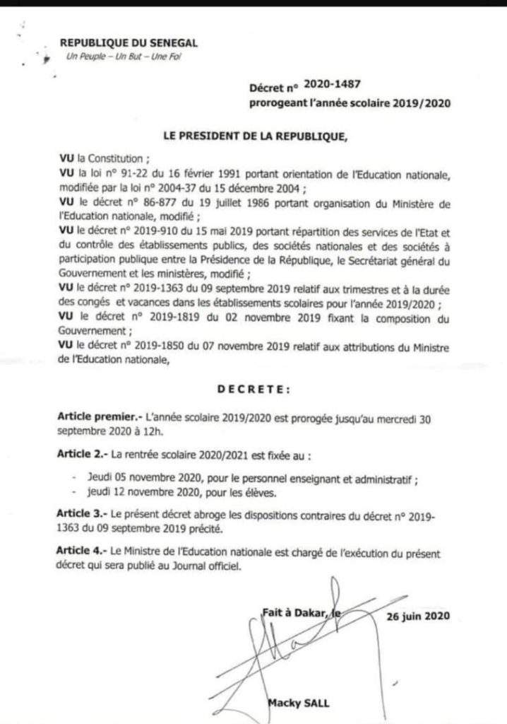 Ledakarois221- Un décret vient d’être rendu public par le président Macky Sall Selon le document l’année scolaire 2019-2020 a été officiellement prorogé jusqu’au 30 septembre 2020. Le début du prochain cycle a été fixé à partir du 5 novembre 2020.