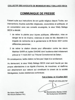Faisant suite aux instructions de son guide religieux depuis Touba, aux interventions d’autres autorités religieuses, coutumières et politiques, et en concertation avec ses conseils soussignés, le sieur Wally Ballago SECK a décidé: